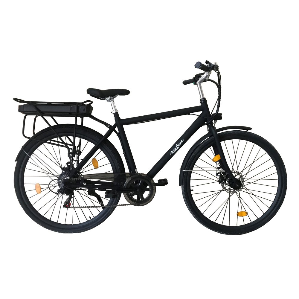 Elcykel med en elmotor på 250W, drivs av ett Li-ion batteri på 36 volt och 10 Ah.