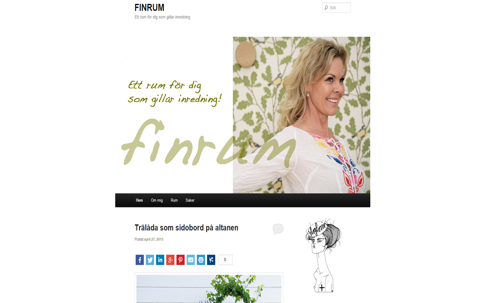 På Finrum bloggar Helene och visar generöst upp sitt stilrena hem som genomsyras av genomtänkt inredning, noga utvalda detaljer samt accentfärger som förstärker och framhäver den redan vackra inomhusmiljön. Finrum ger även flera handfasta tips på vad du ska tänka på när du inreder och visar hur du kan förvandla avlagda lådor till snygga och trendiga förvaringsutrymmen. Bloggerskan Helene är helt enkelt en fena på inredning och layouten av Finrum gör verkligen skäl för namnet för här möter du sannerligen ett fint rum.