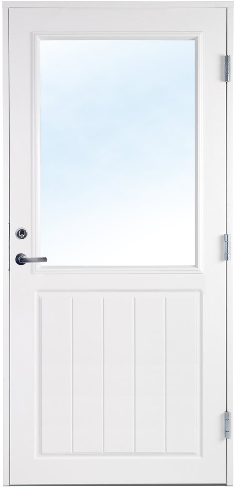 Dörren är dekorerad nedtill på både in- och utsida. Fönstret är en 2-glas isolerruta med Argon vilket ger ett lågt U-värde.