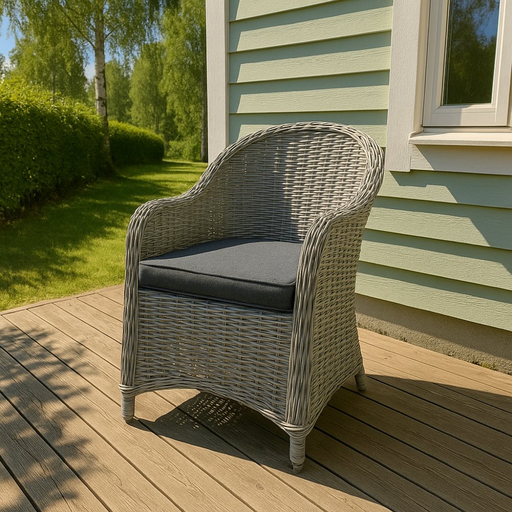 Stilren och funktionell utemöbelgrupp som ger plats för härliga stunder utomhus. Gruppen består av sex bekväma matstolar i gråmelerad konstrotting och ett robust matbord i gråbetsat trä. Stolarna är designade för att ge både komfort och hållbarhet, medan bordets rustika yta tillför en tidlös känsla till din uteplats. Denna möbelgrupp är perfekt för långa middagar eller avslappnade fikastunder med familj och vänner.