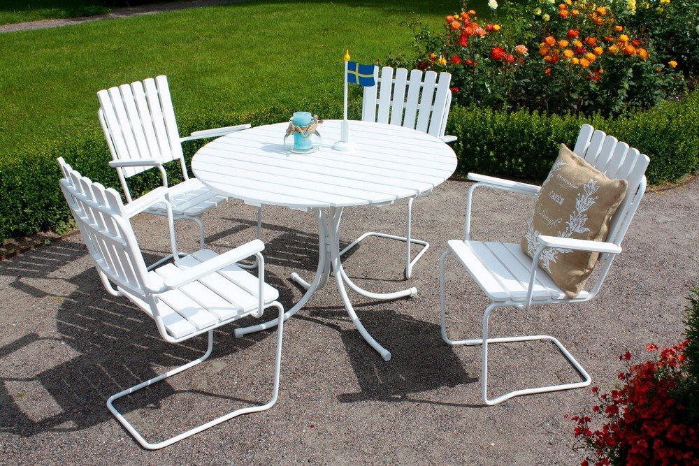 Matgruppen består av ett runt bord och fyra stolar, tillverkade i vitlaserad furu och fjäderstål – perfekt anpassade för den skandinaviska uteplatsen. Den klassiska designen passar lika bra i trädgården som på verandan.