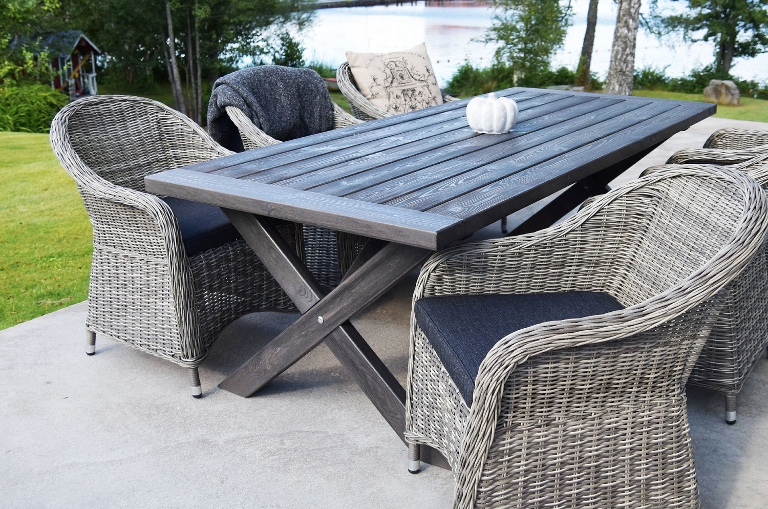 Bordet från Oxford-serien kombinerar hållbarhet och elegans med sin robusta konstruktion i gråbetsat trä. Bordsskivan består av breda plankor som skapar ett rustikt och naturligt intryck medan de stabila kryssbenen tillför både stil och stabilitet. Designen på bordet gör det till ett perfekt val för större uteplatser eller terrasser, där det erbjuder en generös och inbjudande yta för middagar med vänner eller familj utomhus.