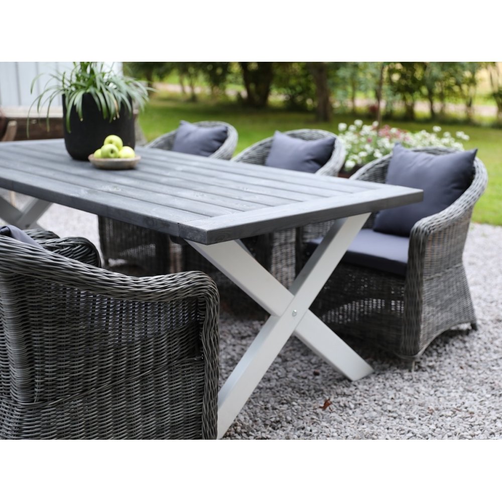 Bordet från Oxford-serien kombinerar hållbarhet och elegans med sin robusta konstruktion i grått med vita bordsben. Bordsskivan består av breda plankor som skapar ett rustikt och naturligt intryck medan de stabila kryssbenen tillför både stil och stabilitet. Designen på bordet gör det till ett perfekt val för större uteplatser eller terrasser, där det erbjuder en generös och inbjudande yta för middagar med vänner eller familj utomhus.
