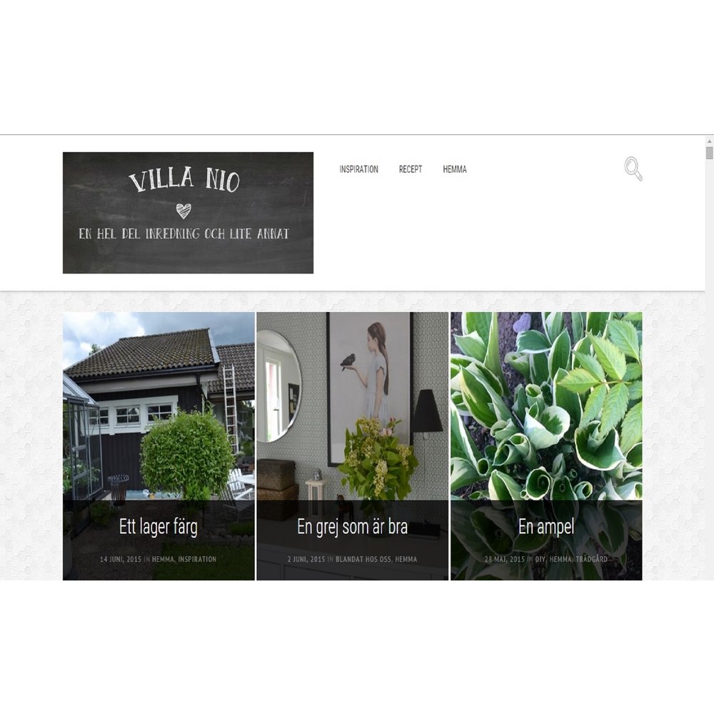 I bloggen Villa Nio skriver Annika om inredning, mat, trädgård, och träning. Vi får även ta del av en drös med olika spännande recept på t.ex. snickersglass och kycklinggratäng, samt massvis med snygga bilder på Annikas smakfulla hem. Några DIY- och boktips får också plats i den stilrena bloggen. Villa Nio innehåller allt och lite till, man fastnar lätt och fortsätter att klicka sig vidare genom arkivet och man blir inte besviken!